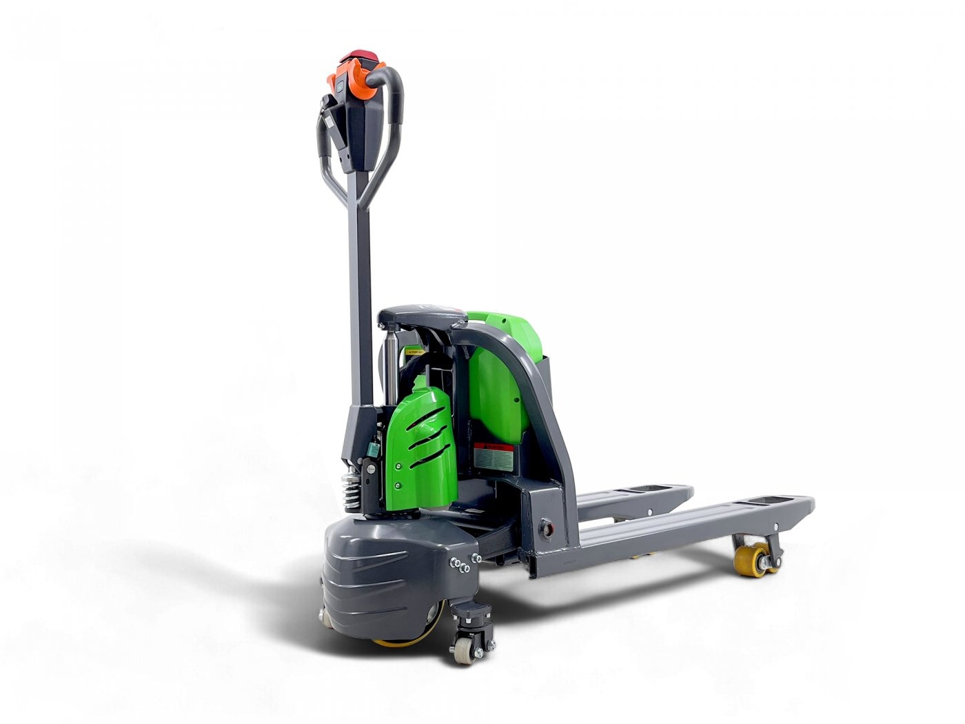 Paleteira elétrica sem mastro, elevação/descida elétrica, direção elétrica, rodas de apoio laterais, retificador incluído.